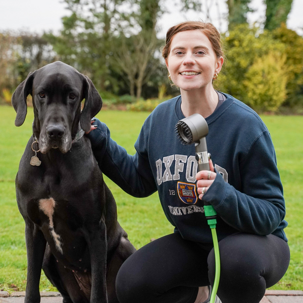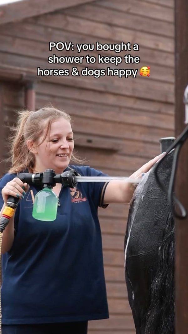 Schließen Sie den Gartenschlauch draußen oder den Duschschlauch drinnen an und genießen Sie ein entspannendes, schnelles Bad mit Ihrem Pferd oder Hund! Verschiedene Wasser- und Seifenmengen lassen sich über den Drehregler einstellen. Das Wasser wird natürlich nicht erhitzt.
